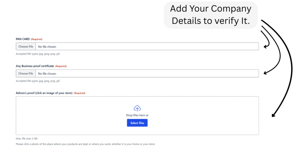 Step 4: Add Your Business Information Fill in details like your Any business certificate, business category, and upload necessary documents like your ID proof and business proof for store verification.